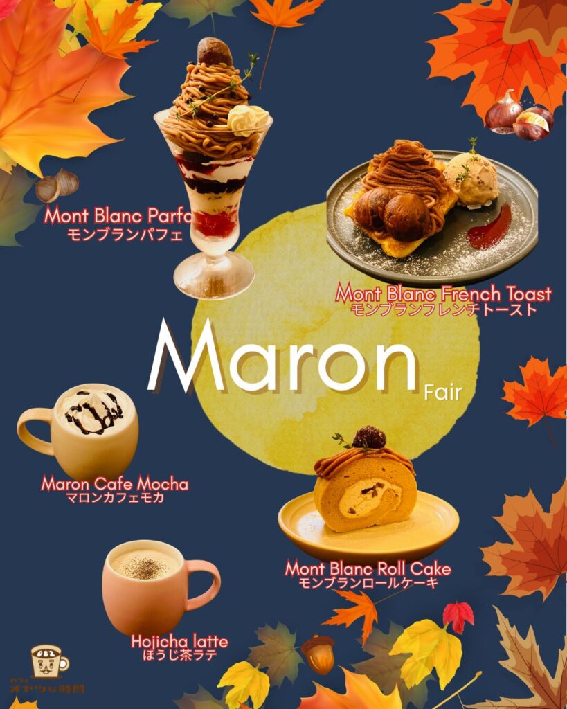 期間限定のマロンフェアスタートします!(販売期間:10/28〜)①モンブランパフェ②モンブランロールケーキ③モンブランフレンチトースト④マロンカフェモカ…